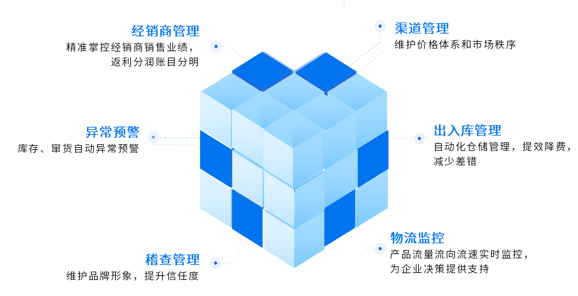 通过一物一码实现企业生产入库、销售出库,经销商采购入库、销售出库,终端进货入库、扫码查询等产品全生命周期管理,以实现质量管理、库存管理、窜货预警、决策支持等服务。
