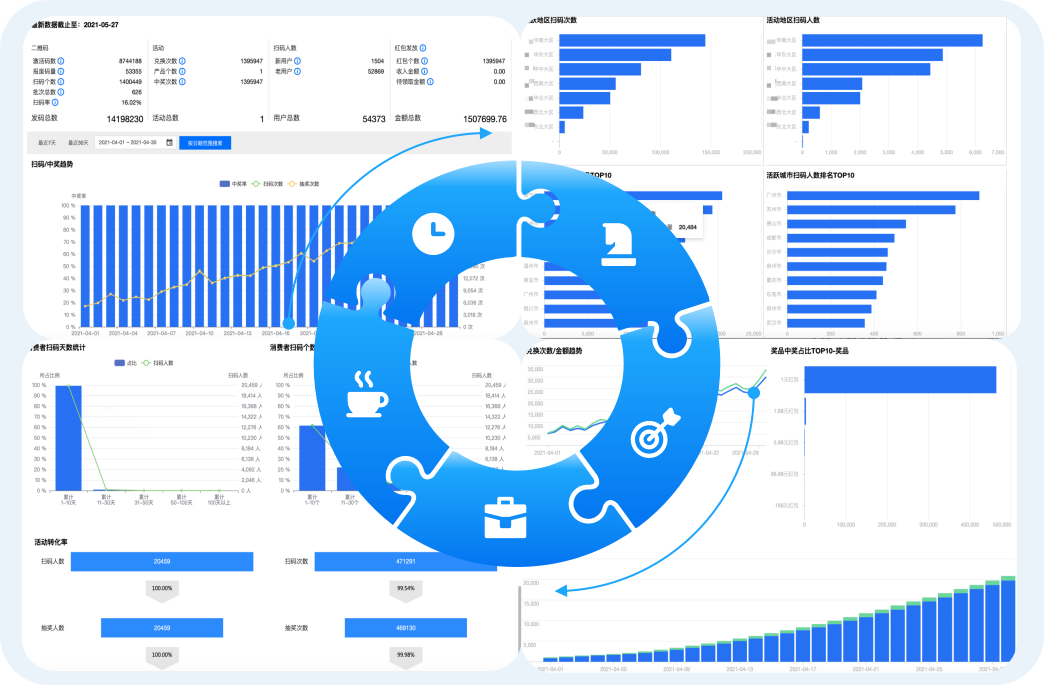 数据智能分析:基于海量脱敏营销扫码数据为品牌提供准确、实时、全方位的活动效果评估和消费者、消费行为多维画像分析,助力有效发现市场机遇、优化营销策略、激发购买热情、提高消费体验。